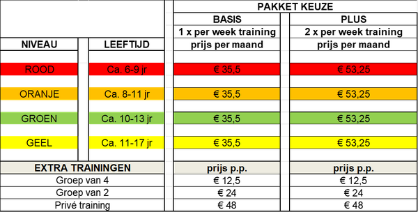 Let op! Conform onze voorwaarden bent u altijd het totale lesgeld voor één heel seizoen verschuldigd. Maar een ongeluk zit in een klein hoekje. Voor het geval dat u vanwege een langdurige blessure of ziekte vijf of meer trainingen achter elkaar mist, kunt u vooraf een restitutieverzekering afsluiten. Dit kost slechts €6,- per seizoen (zijnde €1,- per maand).